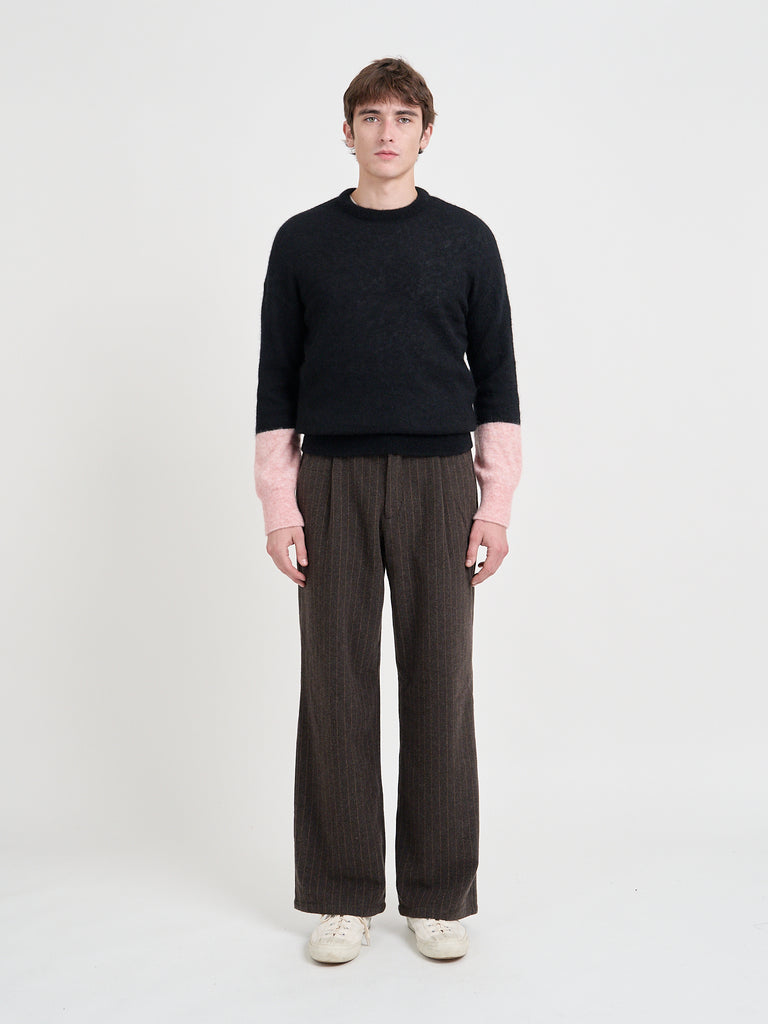 Great knitwear should be the cornerstone of men's winter wardrobes since it so much in terms of texture, colour, pattern, and silhouette. Our Burley jumper has all of these in spades, crafted from an alpaca and merino wool blend for a tactile handle, and a rich black tone with contrasting pink sleeve ends that will elevate all of your cold-weather fits.